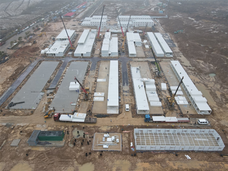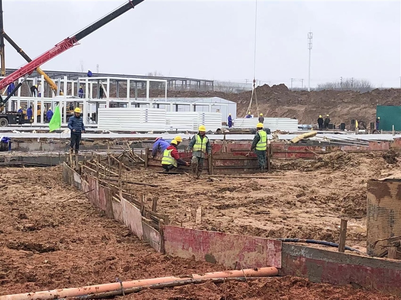 2月10日,農歷正月初十,大雪過后,地面泥濘。隔離區項目現場管理人員及施工人員精神抖擻、有條不紊地開展施工作業,持續推進打包房、折疊房和板房的安裝,水電配套同步進行。