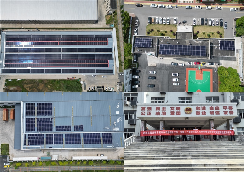 該項目包含宣州區貍橋鎮政府0.03MW、安徽颯拓新材料科技有限公司0.8MW、宣城舜泰機械制造有限公司0.6MW 三處分布式光伏電站,總容量為1.43MW,項目成功并網后年均發電量約為157.92萬千瓦·時,綠色電能得到高效利用,園區企業在正常生產的同時享受到實實在在的綠色紅利,并進一步助推區域環境、經濟及社會效益有效提升。